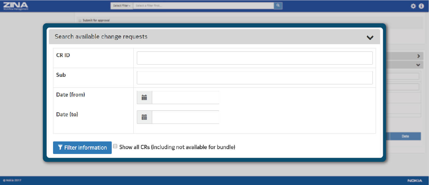 You can filter and search available and not available Change Request, complete the fields and click on “Filter information" blue button.