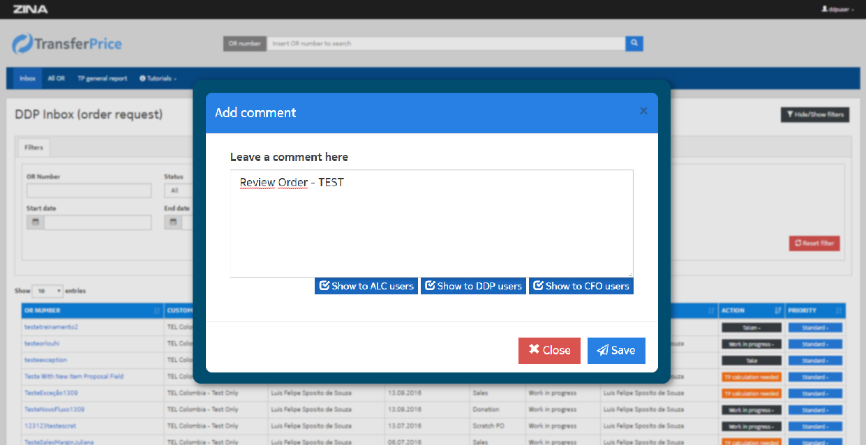 Write your comments and click the blue "Save" button to send and save or the red "Close" button to close.