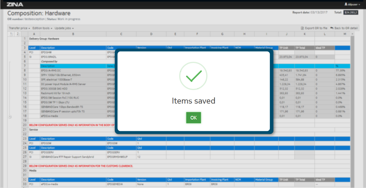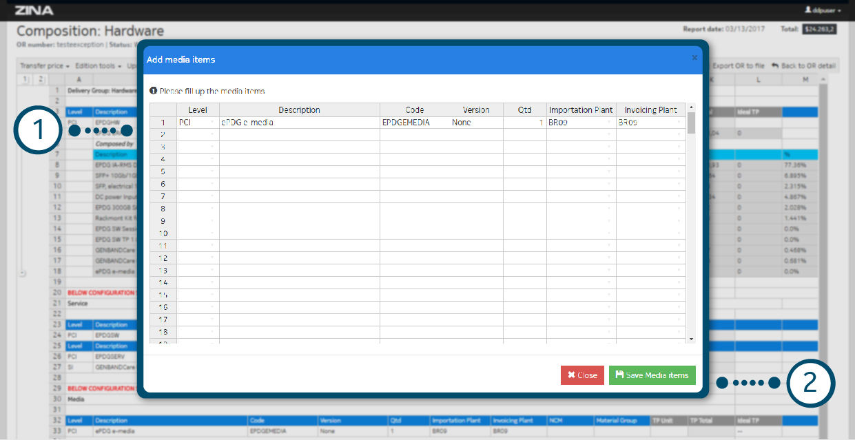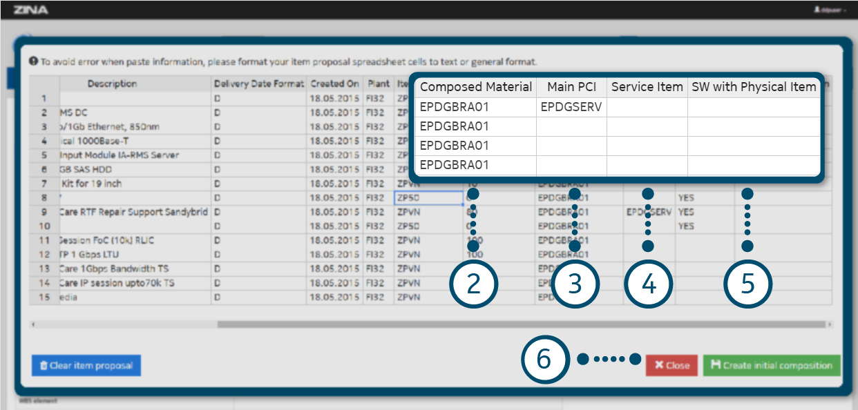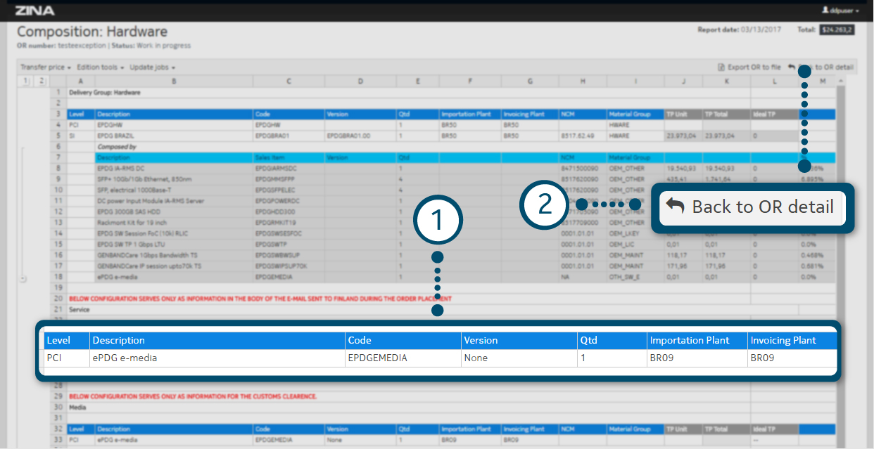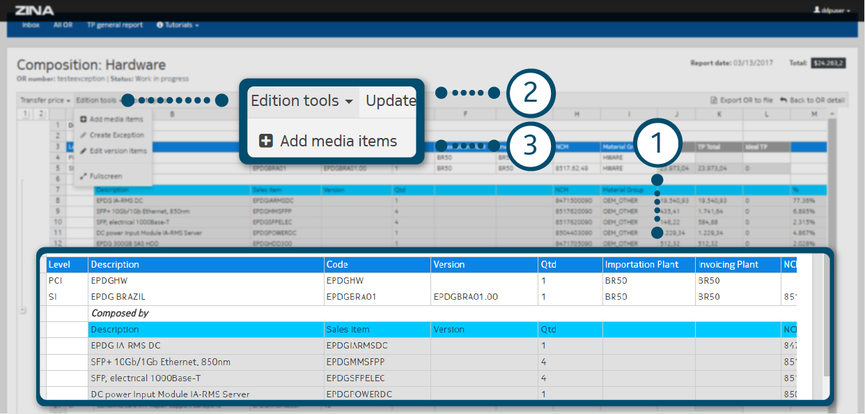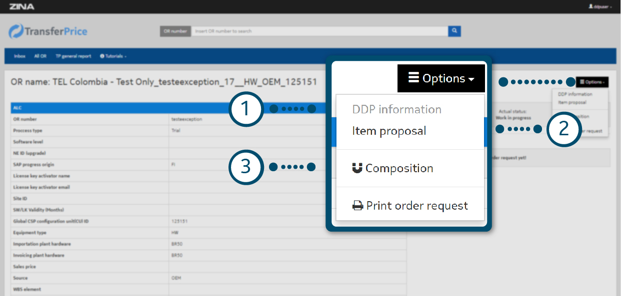 You will find the options "DDP information", "Item proposal" and "Composition" which correspond to the user "DDP" and must be selected in the order indicated in the following image.