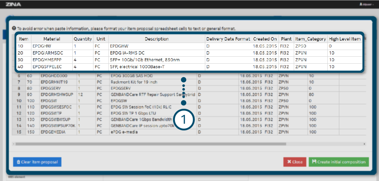 Complete the "Item proposal" fields by copying and pasting from your .xls file verifying that the order of the columns match.