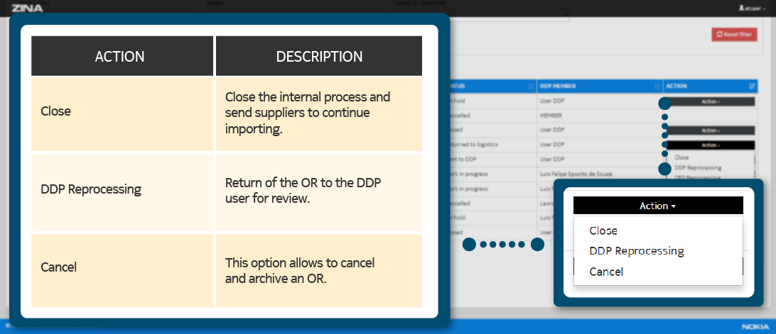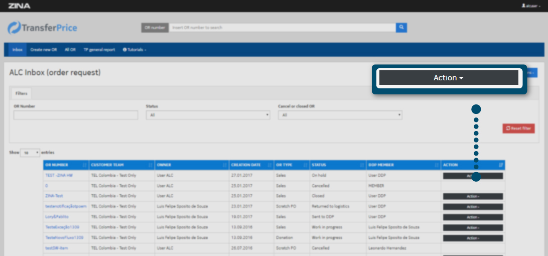 Locate in the row of the "OR" to edit, in the column "ACTIONS" and display the options of the black button "Action", as the image indicates.
