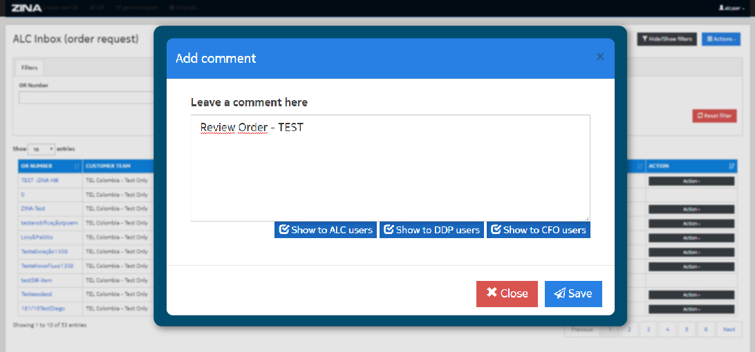 To finish write your comments and click the blue "Save" button to send and save or the red "Close" button to close.
