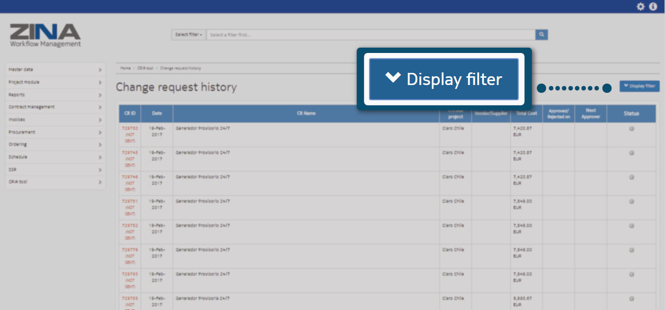 You can filter CRIA - Change Request History list, click on "Display" blue button.