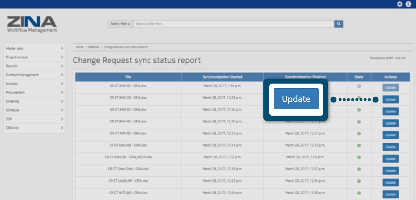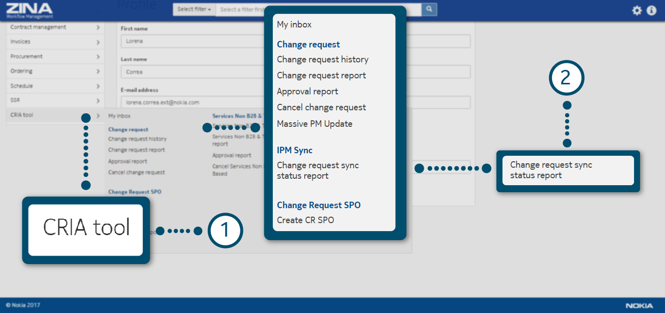 1. Display the side menu, display the “CRIA Tool" options. 2. Select the “Change request sync status report” option as the image indicates.