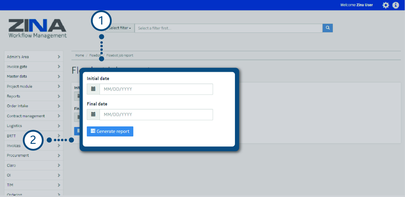 1.Configure initial and final date. To finish, click on "Generate report" blue button, as the image shows.