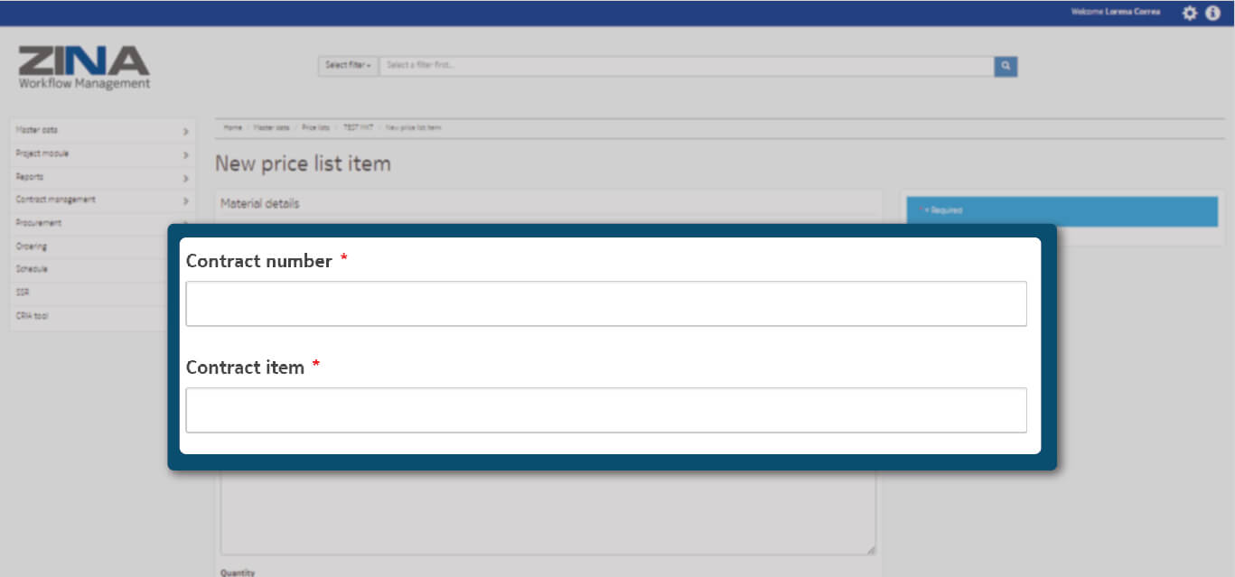To finish, complete the "Contract number" and "Contract item" fields, as the image shows.
