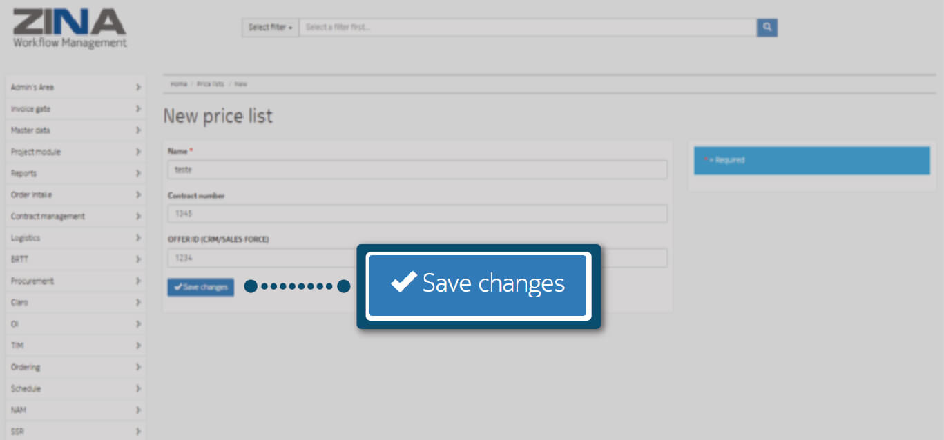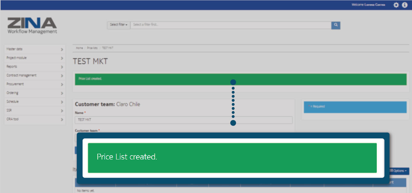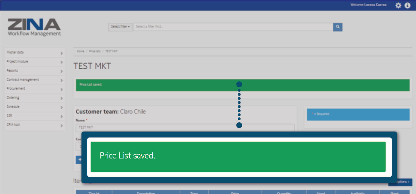 If the creation of the "Price List" and "Price List items" was successful, a green alert will be displayed with "Price List Saved" message.