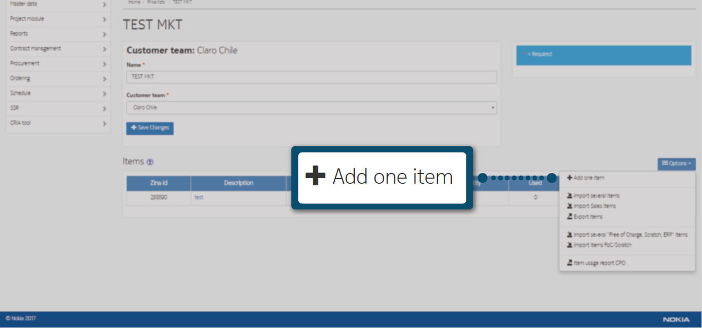 Once the "Options" button content is displayed, select the "Add new item" option for adding new items to the Price list created.