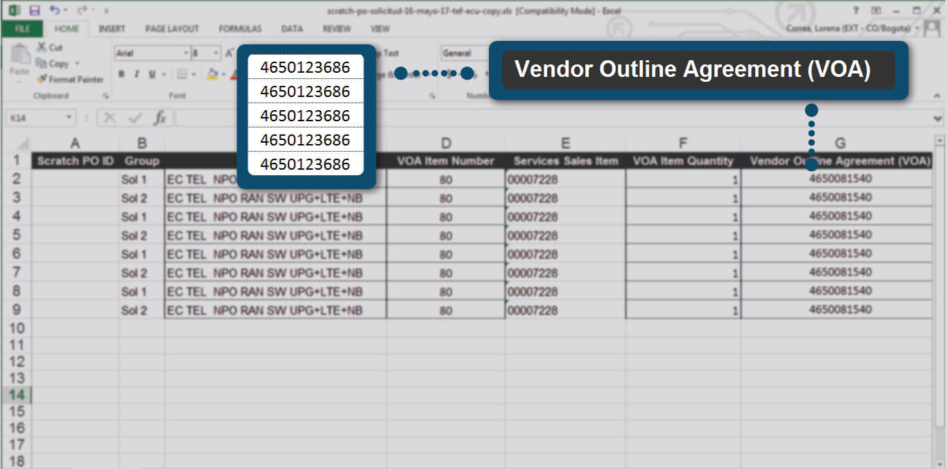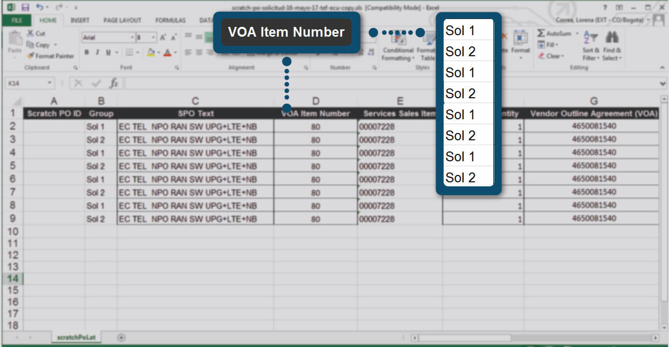 Complete “VOA Item Number” column, enter the number of "Sales item" within the VOA that corresponds to each group, according to the image.
