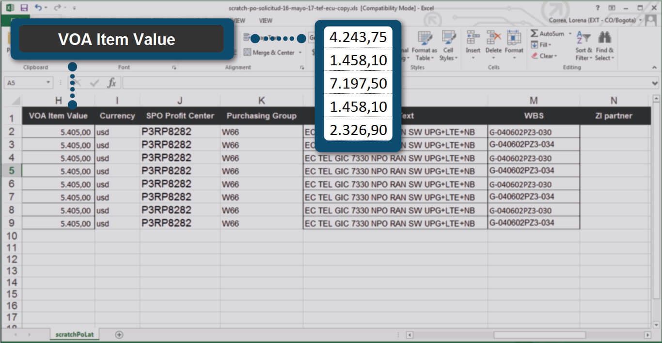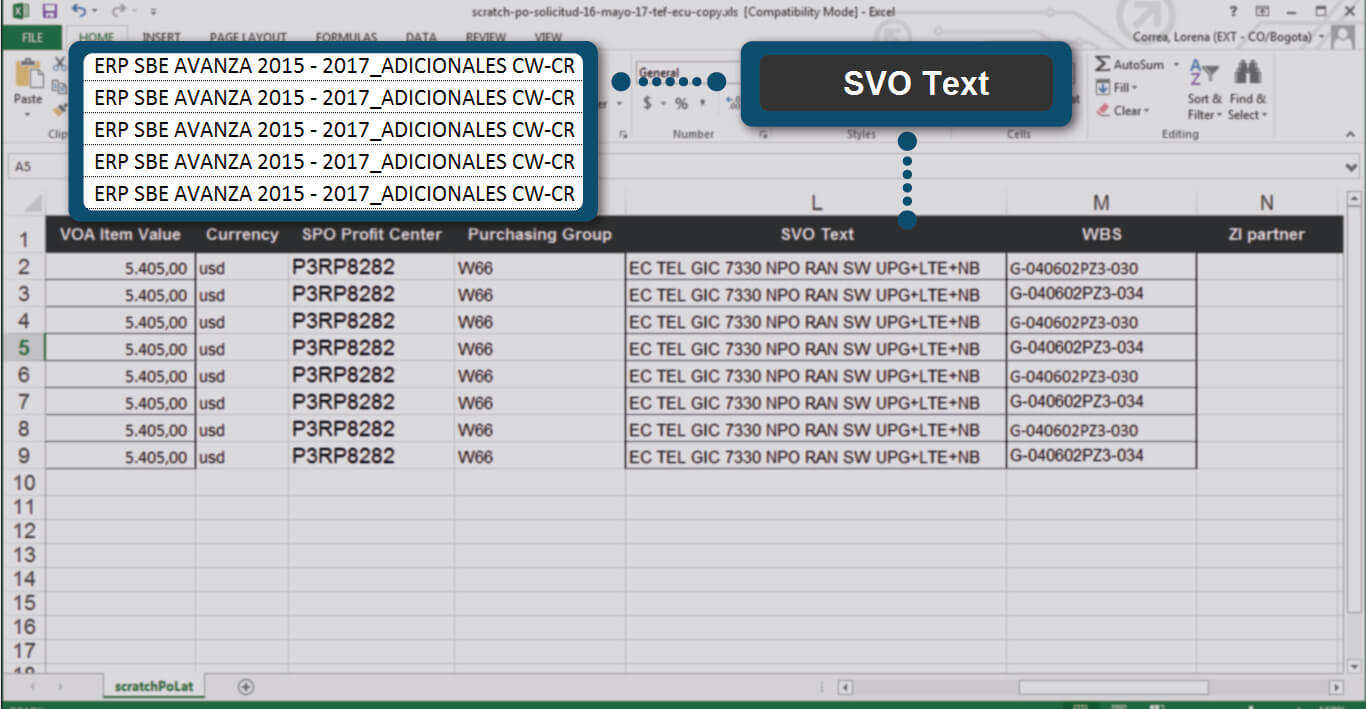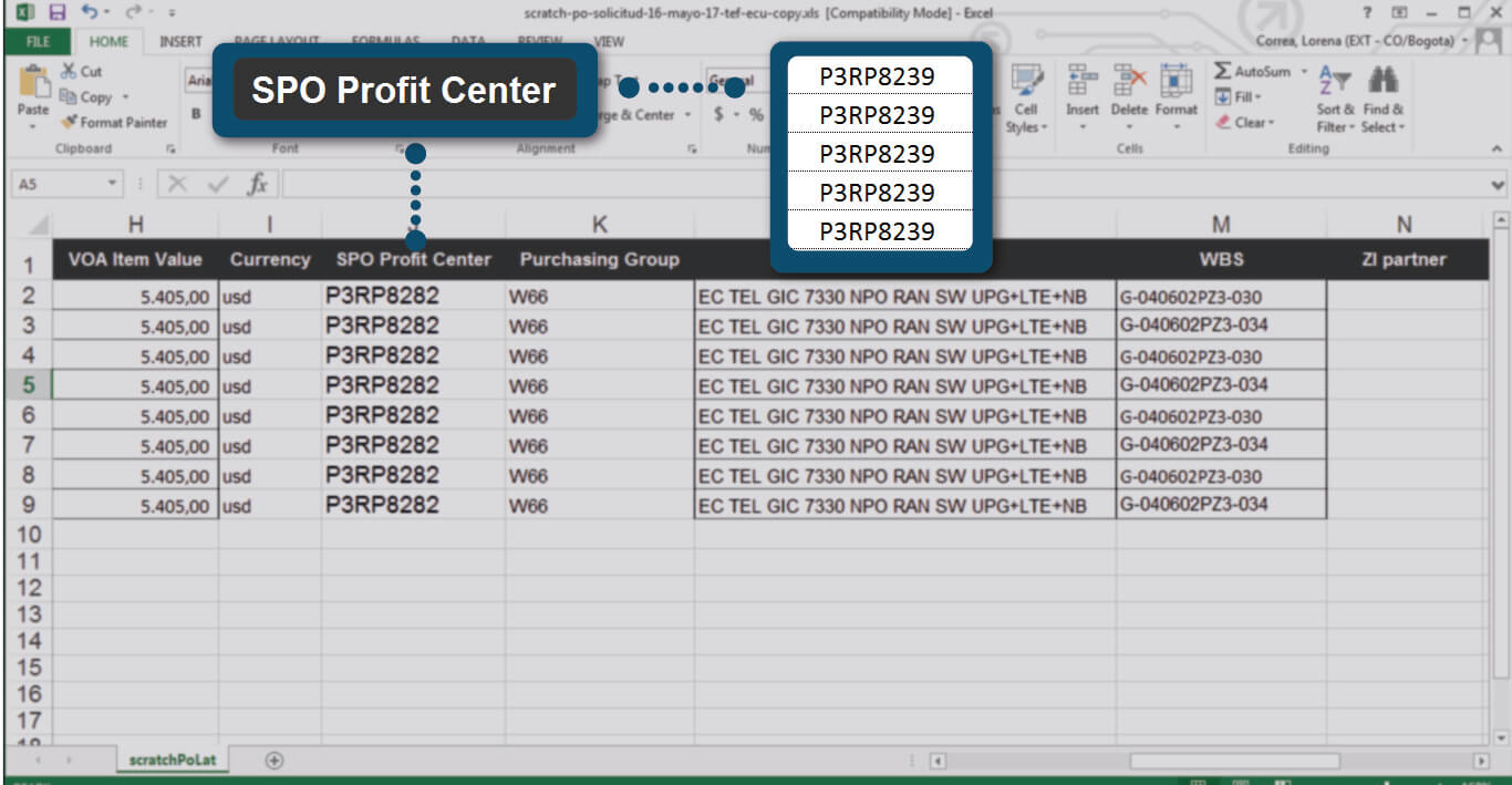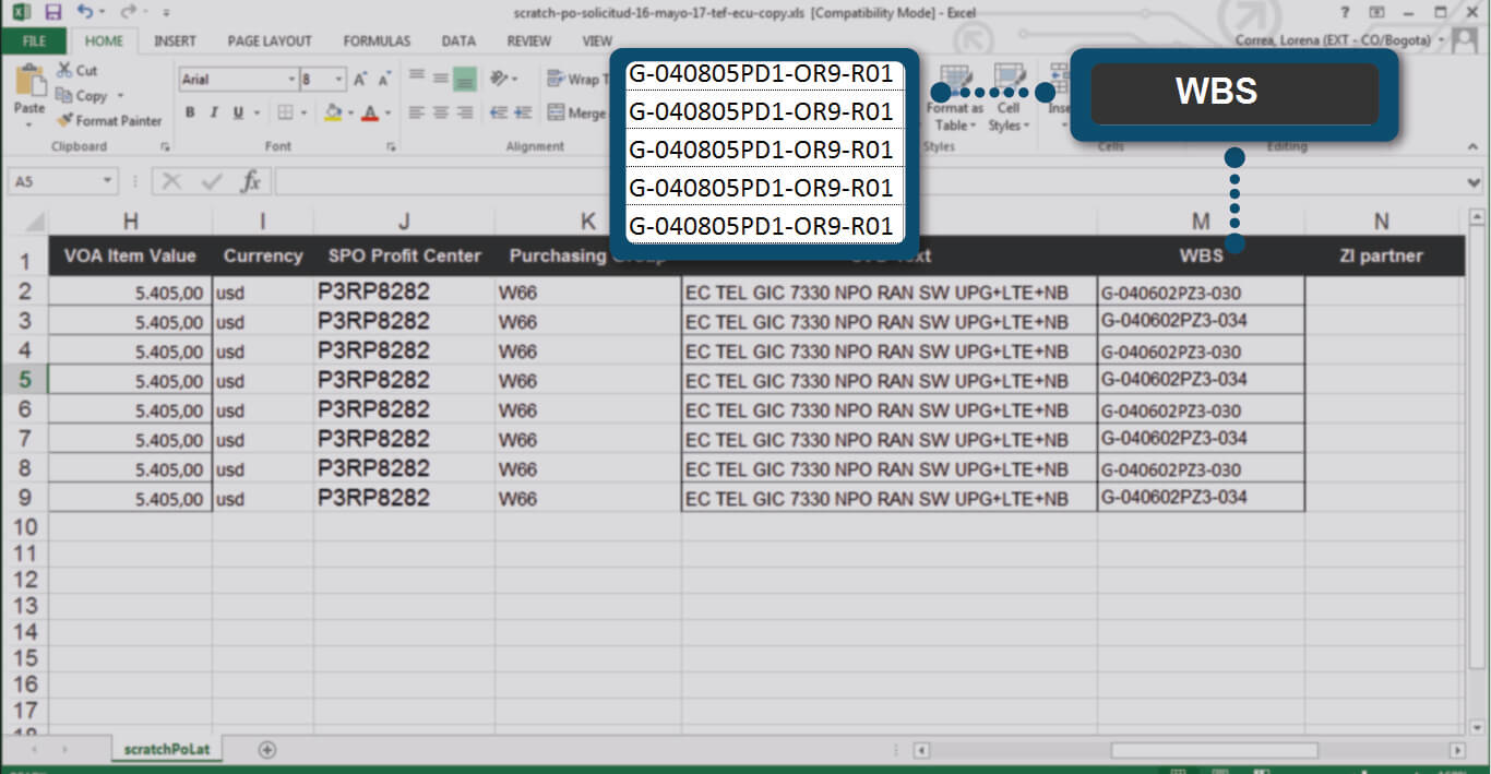 The WBS information from SAP and complete the "WBS" column. Use a 4th Level WBS (ex: Telecom Personal) or a 3rd Level WBS (ex: CLARO Colombia). Both are valid data entries.