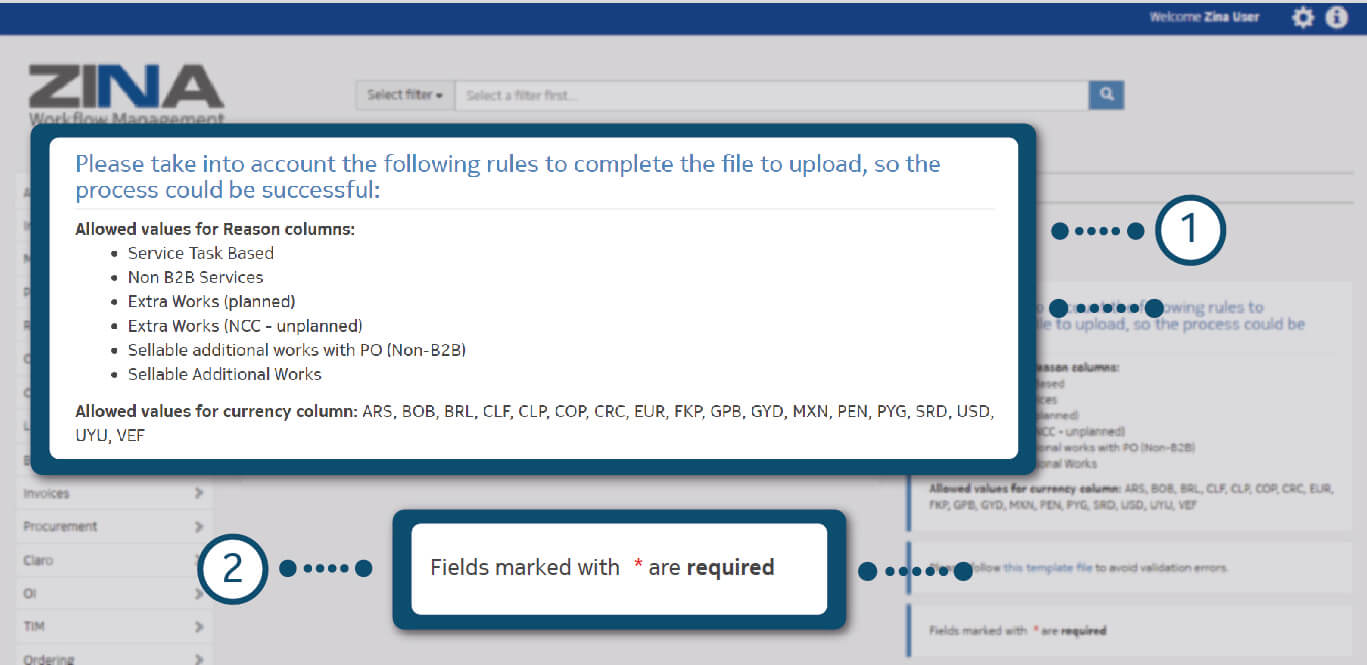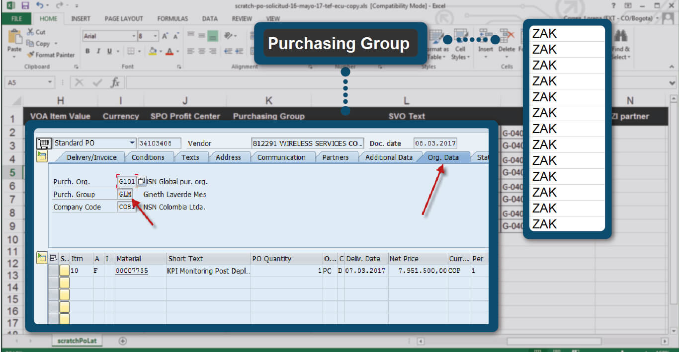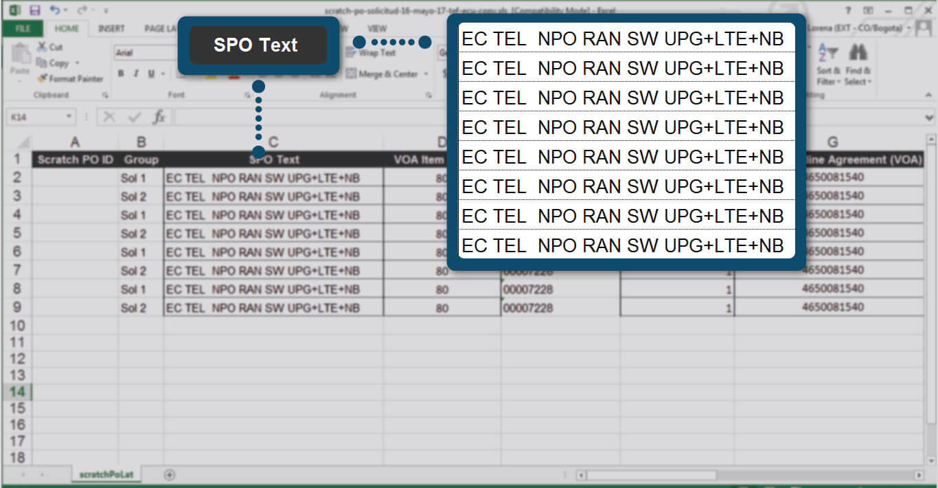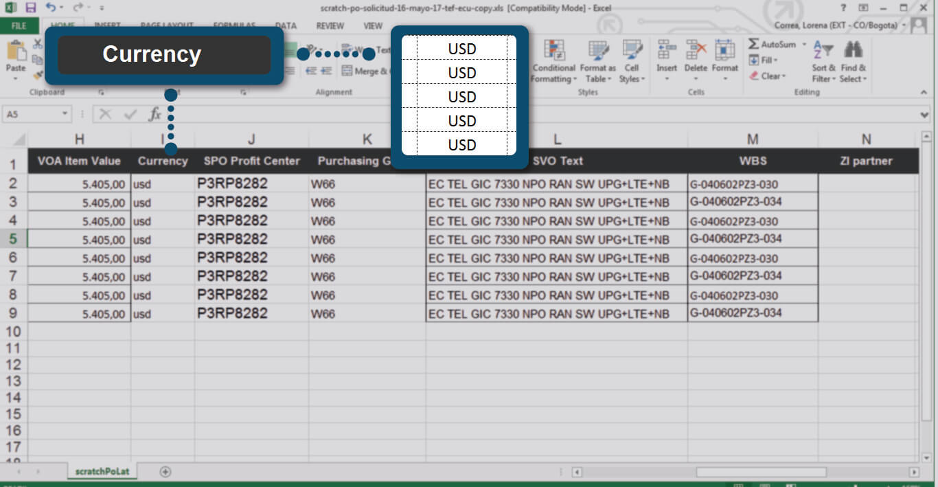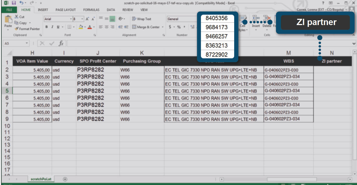 The WBS information from SAP and complete the "WBS" column. Use a 4th Level WBS (ex: Telecom Personal) or a 3rd Level WBS (ex: CLARO Colombia). Both are valid data entries.
