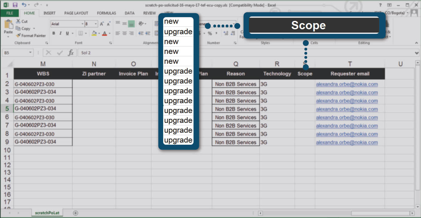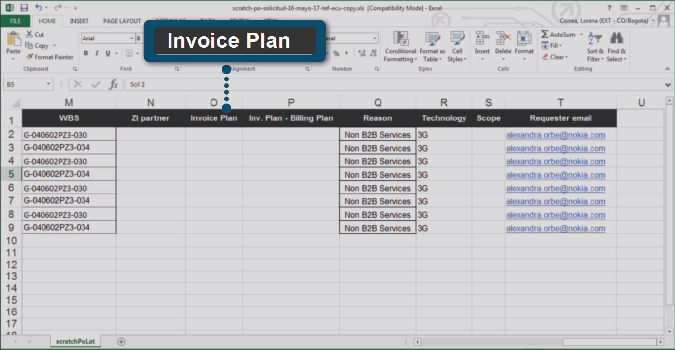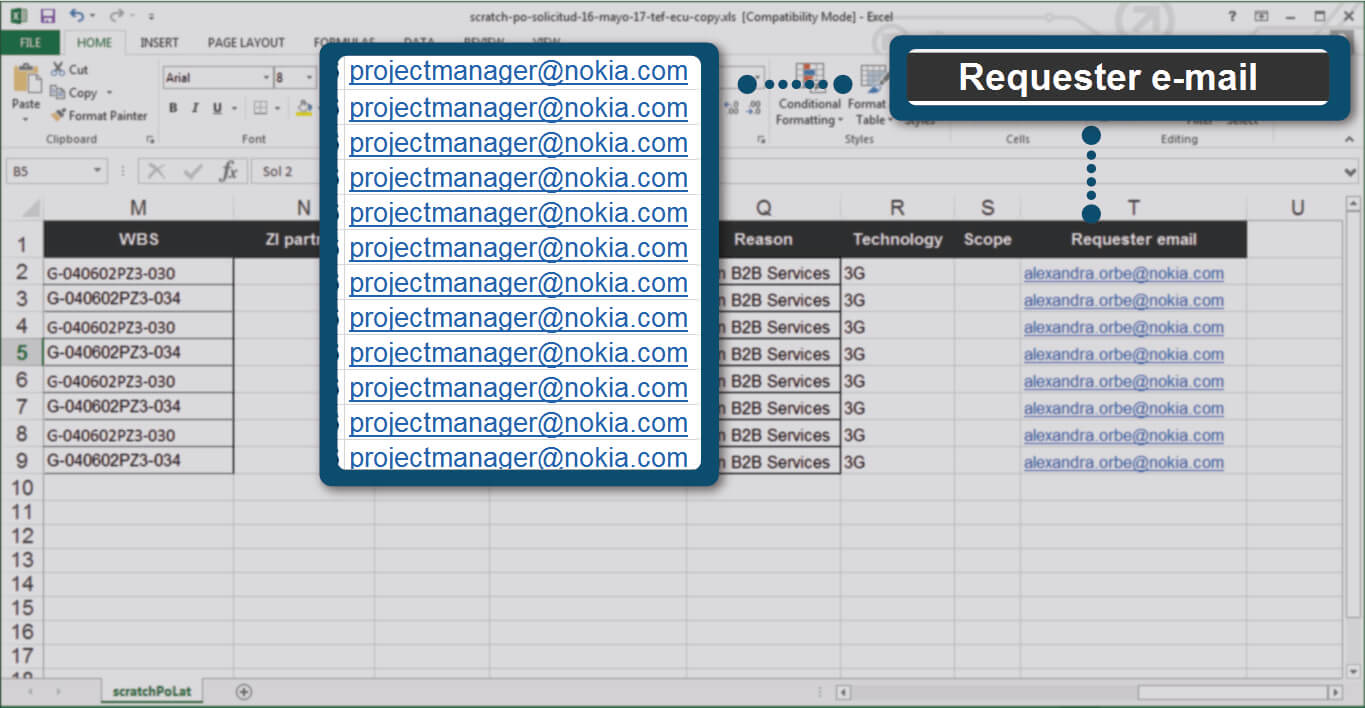 In the "Requester e-mail" column, enter the corporate email (@ Nokia.com) of the Project manager that supervises and approves the import of the new Scratch PO Change Request.