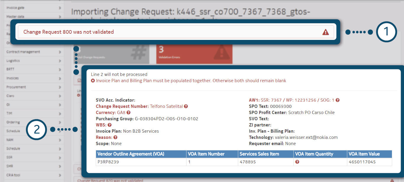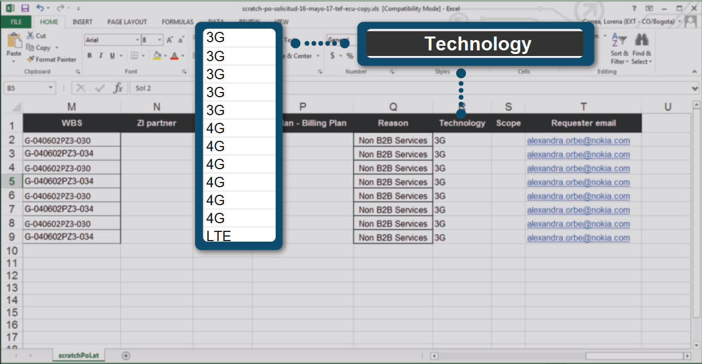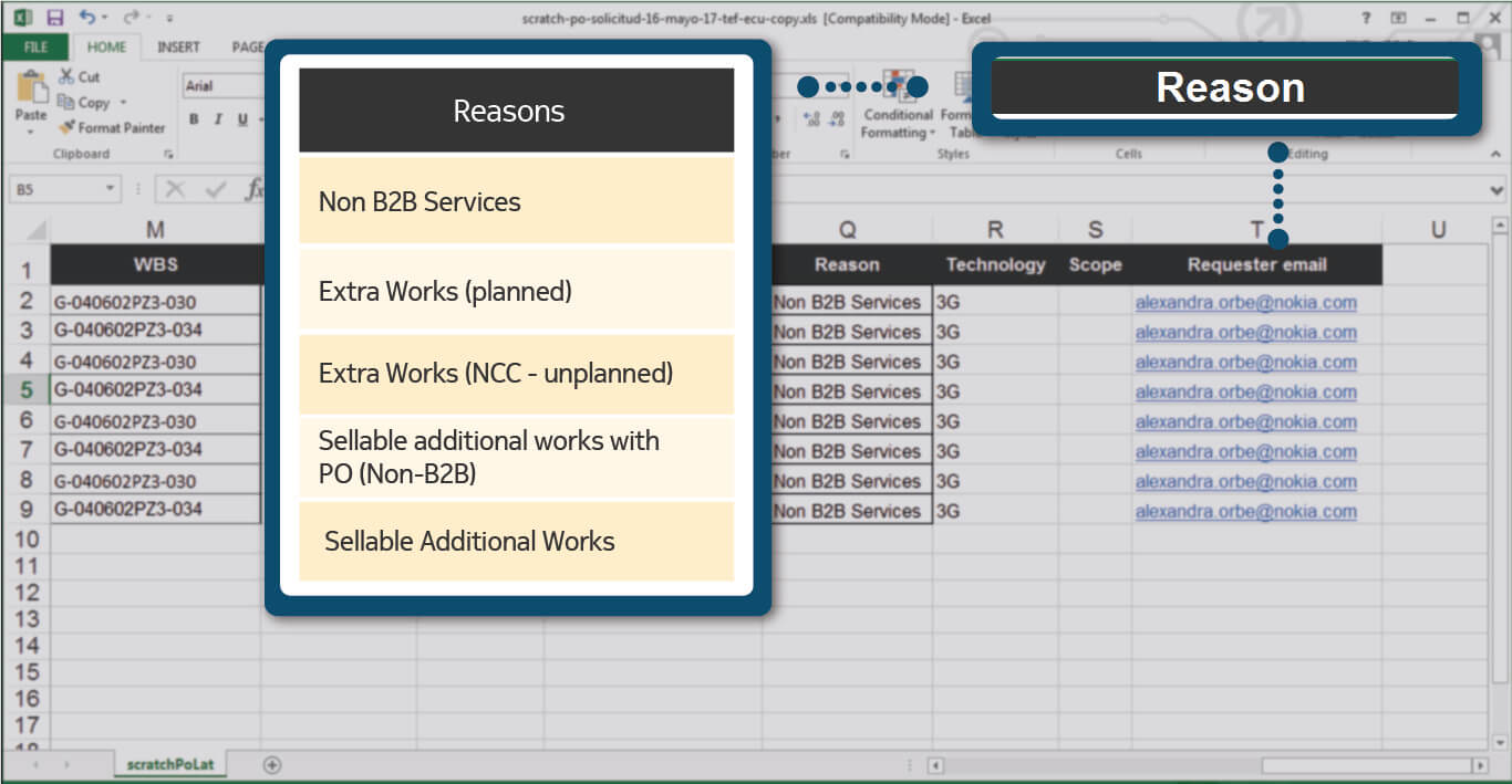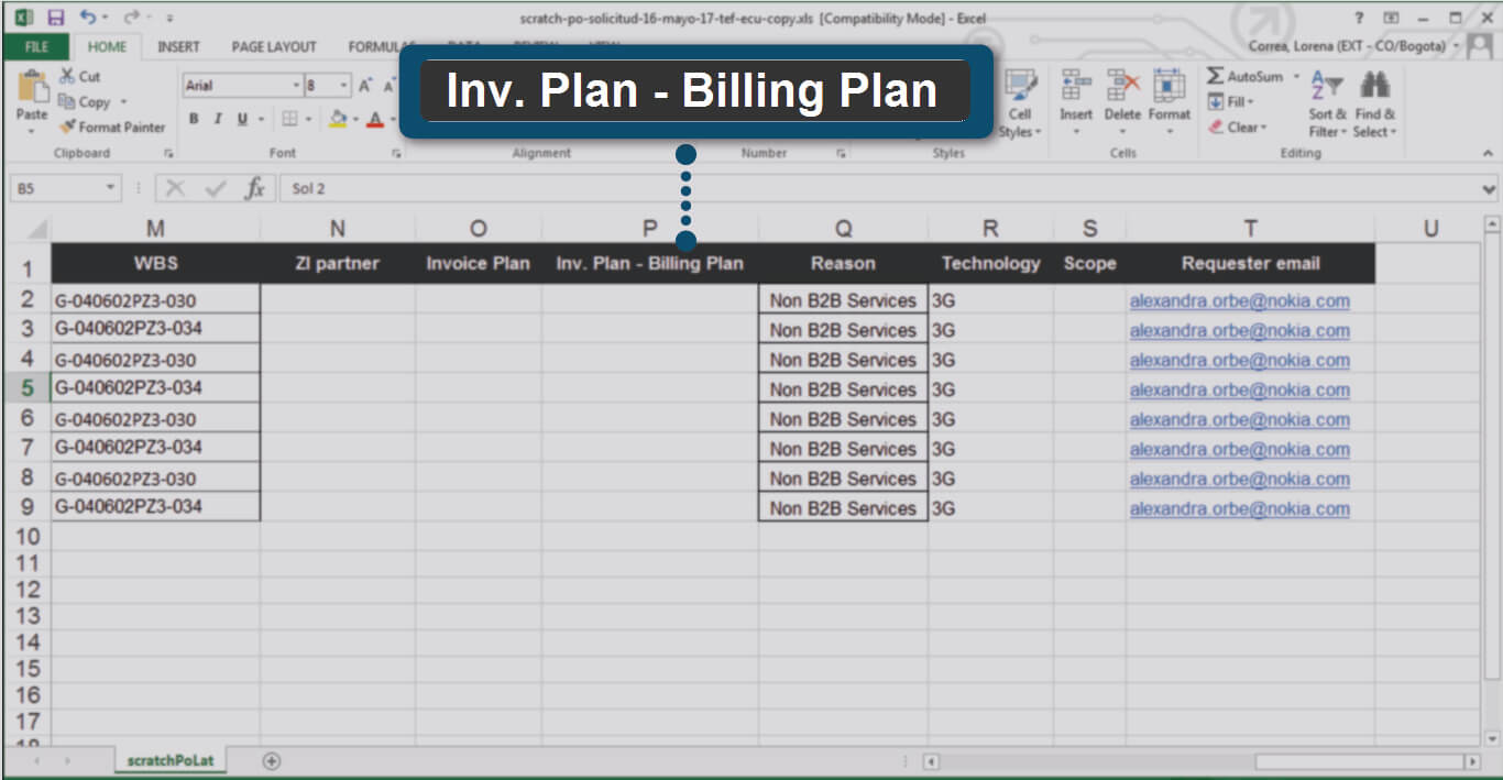 In the "Requester e-mail" column, enter the corporate email (@ Nokia.com) of the Project manager that supervises and approves the import of the new Scratch PO Change Request.