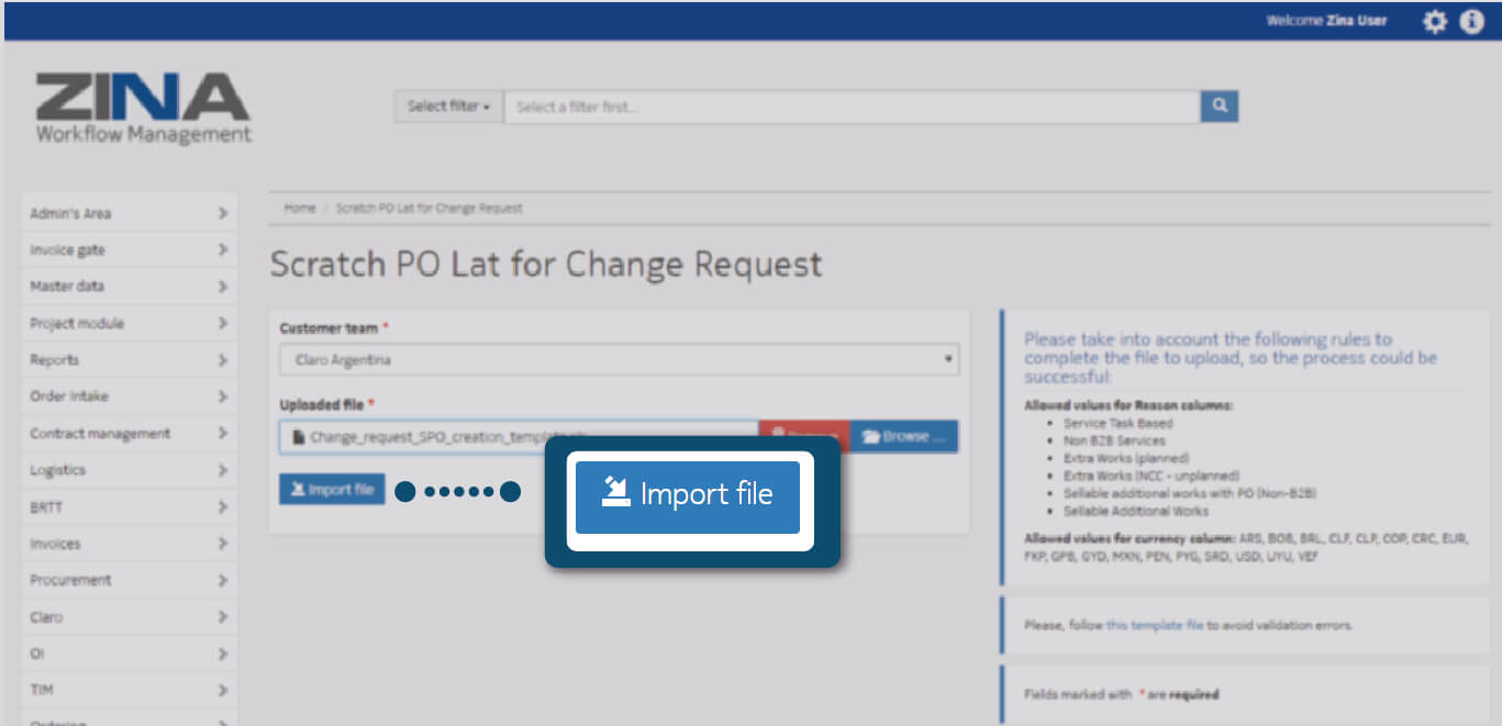 Once you have finished uploading the file, click on the blue "Import file" button, as the following image indicates.