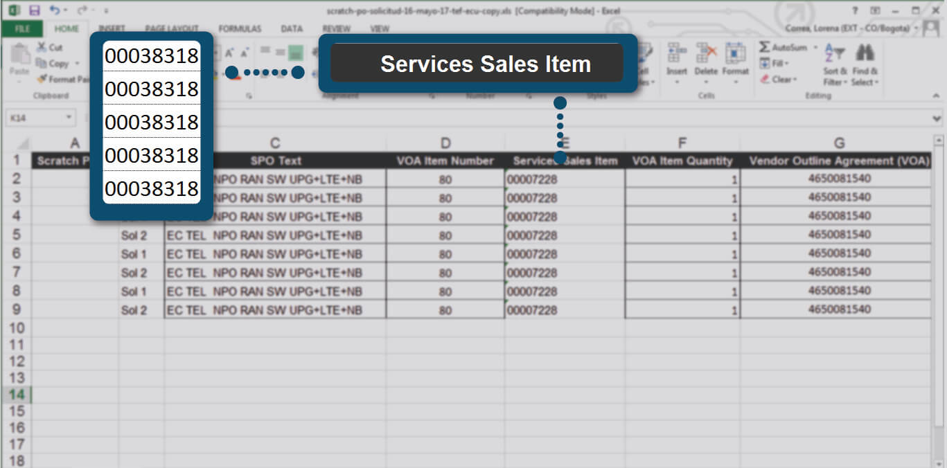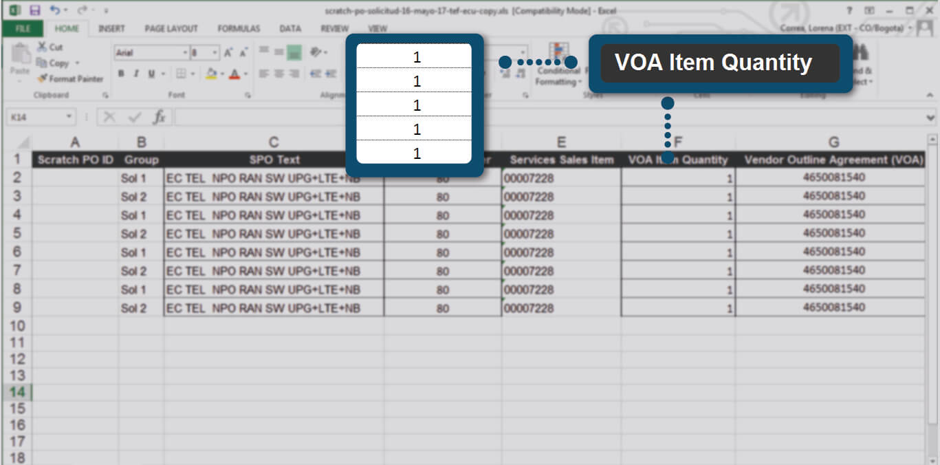 Complete “VOA Item Value“ column with the respective VOA sales item price. The number format must be commas separating the decimals and without points separating the thousands, as the image shows.