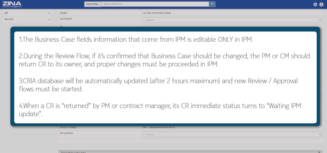 • CRIA acts in the process of Change Requests approval. It is still needed and mandatory the usage of IPM for all other processes associated with CRs.