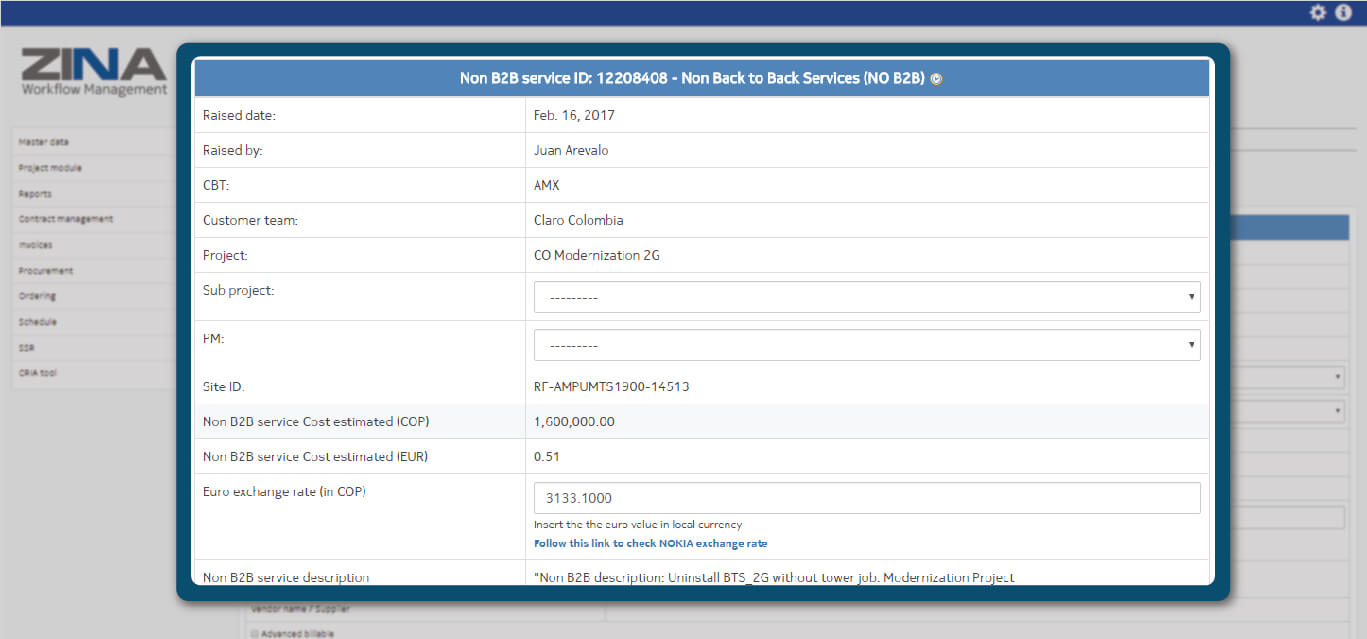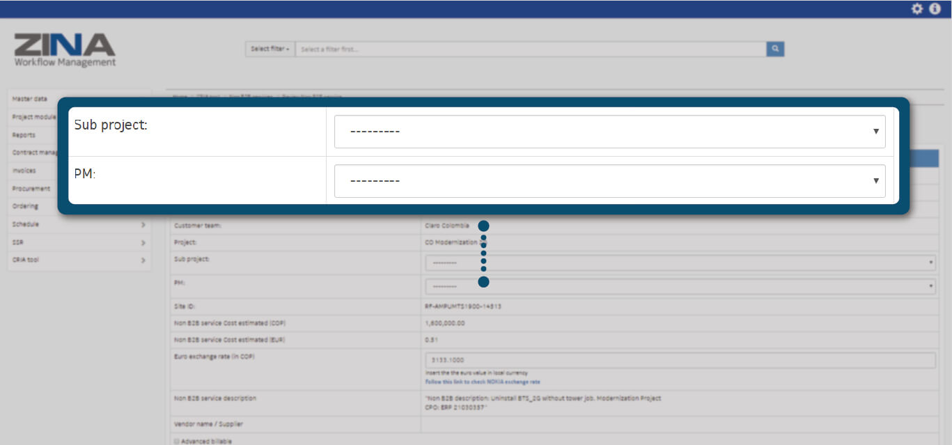 Select a subproject. If only has been creating a CT subproject, this field will not be editable. Then define PM user responsible for validating this Services NonB2B.